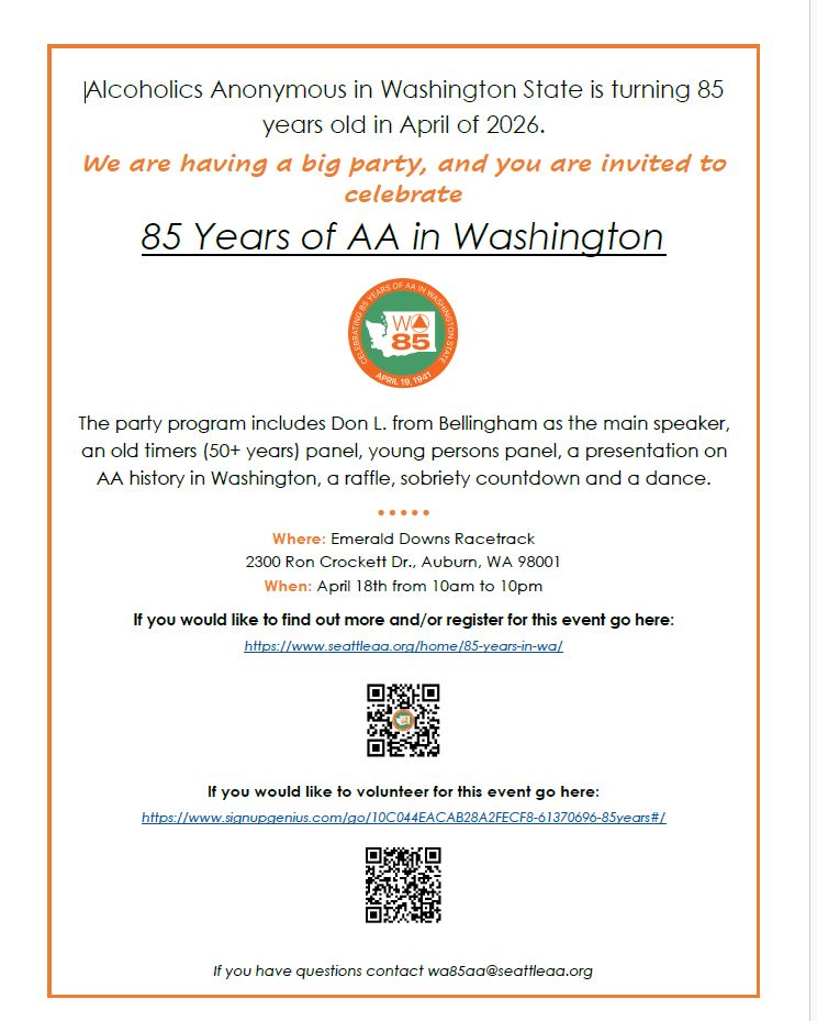 Featured🎉 Washington State AA is turning 85 — and we’re throwing a celebration! 🎉 Eighty‑five years of recovery, service, and unity is a milestone worth shouting from the rooftops, and […]